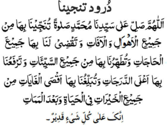 اللَّهُمَّ صَلِّ عَلَىٰ سَيِّدِنَا مُحَمَّدٍ صَلَاةً تُنَجِّيْنَا بِهَا مِنْ جَمِيْعِ الْأَهْوَالِ وَالْآفَاتِ، وَتَقْضِيْ لَنَا بِهَا جَمِيْعَ الْحَاجَاتِ، وَتُطَهِّرُنَا بِهَا مِنْ جَمِيْعِ السَّيِّئَاتِ، وَتَرْفَعُنَا بِهَا عِنْدَكَ أَعْلَى الدَّرَجَاتِ، وَتُبَلِّغُنَا بِهَا أَقْصَى الْغَايَاتِ مِنْ جَمِيْعِ الْخَيْرَاتِ فِي الْحَيَاةِ وَبَعْدَ الْمَمَاتِ، إِنَّهُ سَمِيعٌ قَرِيبٌ مُجِيبُ الدَّعَوَاتِ.